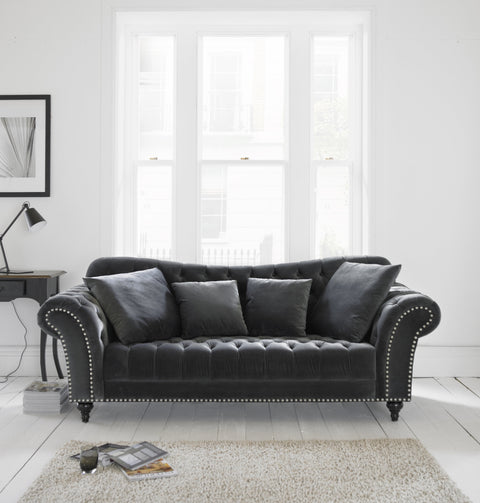 The Calgary 3 Seater Sofa brings a touch of luxury to any living area. Stylish and practical, the large sofa is upholstered in a rich grey plush fabric for an eye-catching look. With its rolled armrests and a deep-buttoned design, this sofa's additional design touches of metal stud detailing, solid wood feet, this sofa has been thoughtfully designed while retaining comfort and luxury thanks to its cushions and fabulous design.