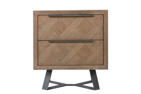 This stunning Ibis collection features a hand-designed parquet inlay on cabinet fronts and the aged grey oak finish allows the beauty of the wood to shine through, it is paired with discrete top-mounted handles and modern angled metal legs both in gunmetal grey. This collection benefits from quality elements such as metal drawer