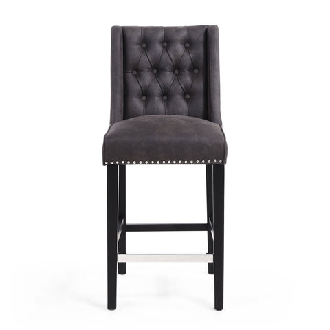 The Marl Barstool is sure to radiate luxury throughout your dining room with its soft-touch, suede effect charcoal fabric and black rubberwood legs. The stool is embellished with silver studs and features a buttoned backrest for an added stylish touch.